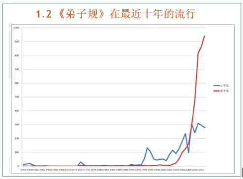 那么我们来看看,它是从何时开始被捧高的。我们看这张图,是中国期刊网上以“弟子规”和“三字经”分别为关键词进行检索的结果。从1956-2000年之间几乎没有人提到弟子规,但从2004年开始,它就飞速上涨,到2008年曝光率超过“三字经”。2004年之后的十年间,“三字经”的使用率膨胀了2.4倍,而“弟子规”的使用率膨胀了70倍。它在文献数据库中的检出率对应着它在社会上的知名度,在最近十年里,远远超出《三字经》和《论语》。台湾的情况也差不多,台湾师范大学的刘雅苓就说,《弟子规》研究,是到民国八十八年(2000)才得到重视。