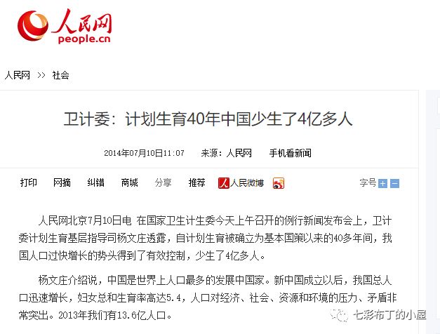 据人民网2014年7月10日刊登的文章报道,国家卫计委计划生育基层指导司杨某某曾骄傲的宣称,自计划生育被确立为基本国策以来,我国人口少生了4亿多人,不但缓解了对资源环境的压力,也明显改善了人民的生活和发展状况。